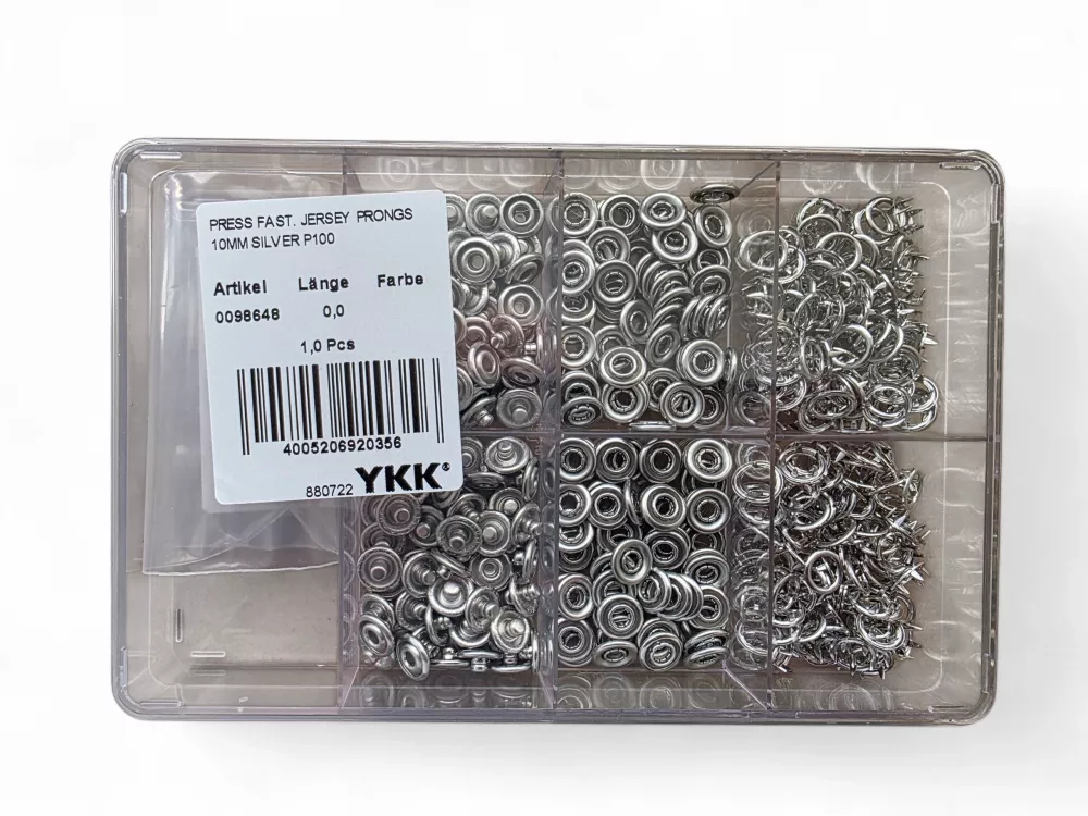 YKK Jersey Druckknöpfe, 10 mm, Silber, rostfreies Messing. 100 Stück je Packung. Leichte Schließkraft für Jerseystoffe. Werkzeug separat.